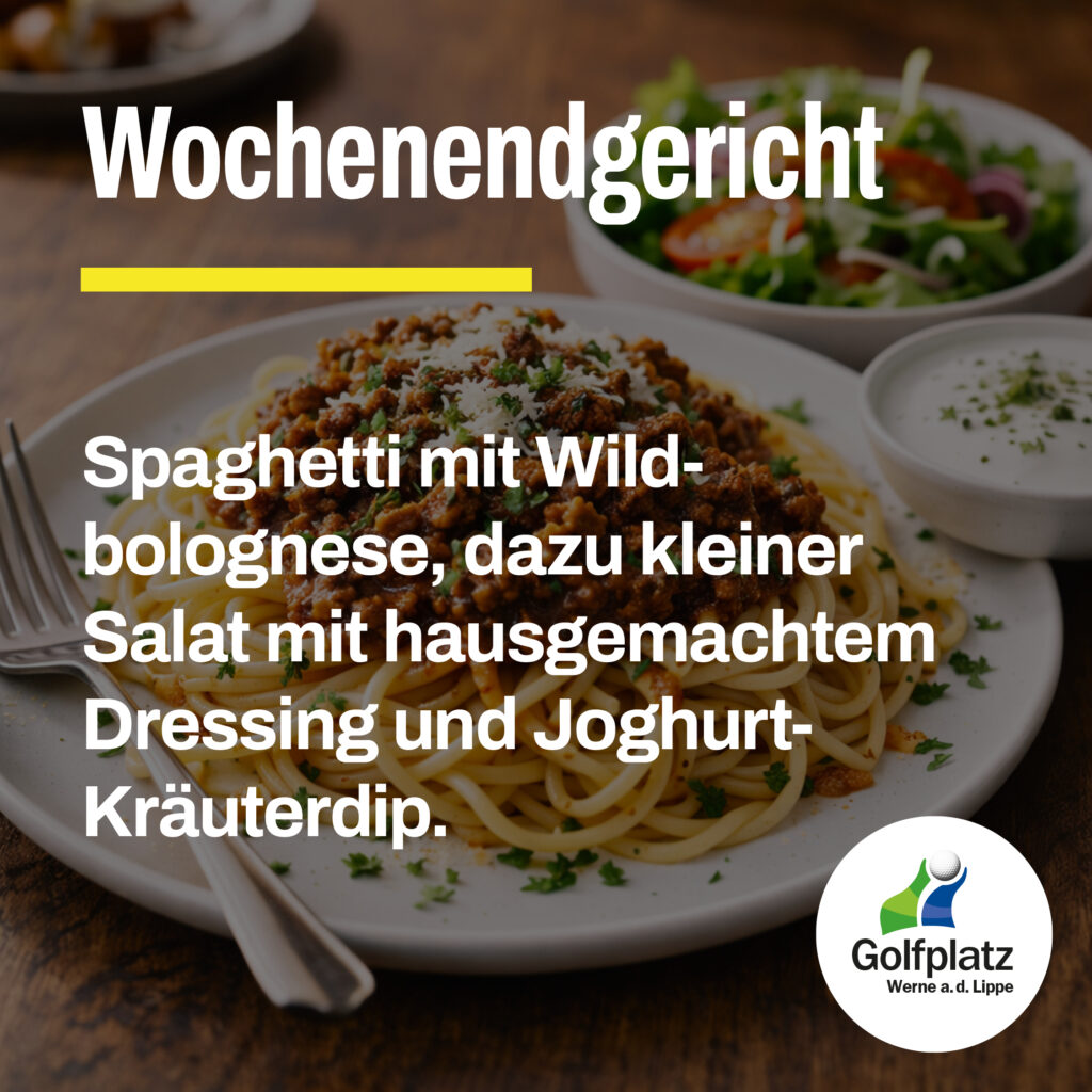 🚩 Wochenendgericht: Spaghetti mit Wildbolognese, dazu kleiner Salat mit hausgemachtem Dressing und Joghurt-Kräuterdip