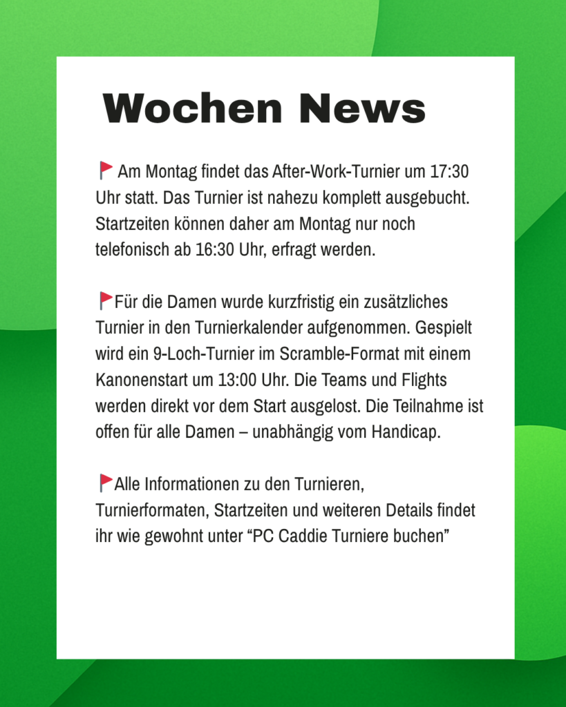 🚩 Am Montag, 27.04. findet das erste Afterwork 2026 (Tee 1-9) statt. Los geht’s um 17:30 Uhr, Kanonenstart. Insbesondere für Berufstätige, die den Feierabend mit einer sportlichen Golfrunde verbringen möchten. Achtung: Das Turnier ist nahezu komplett ausgebucht. Startzeiten können daher nur noch am Montag telefonisch ab 16:30 Uhr erfragt werden.